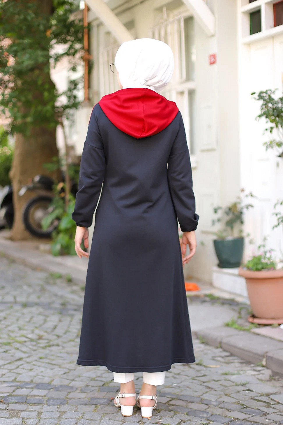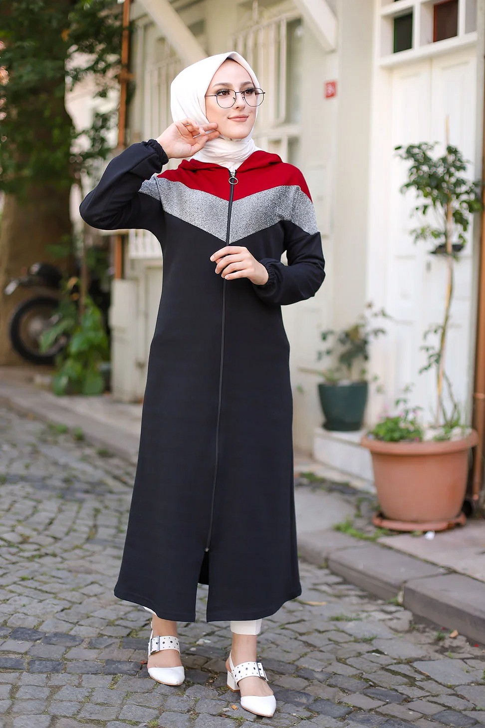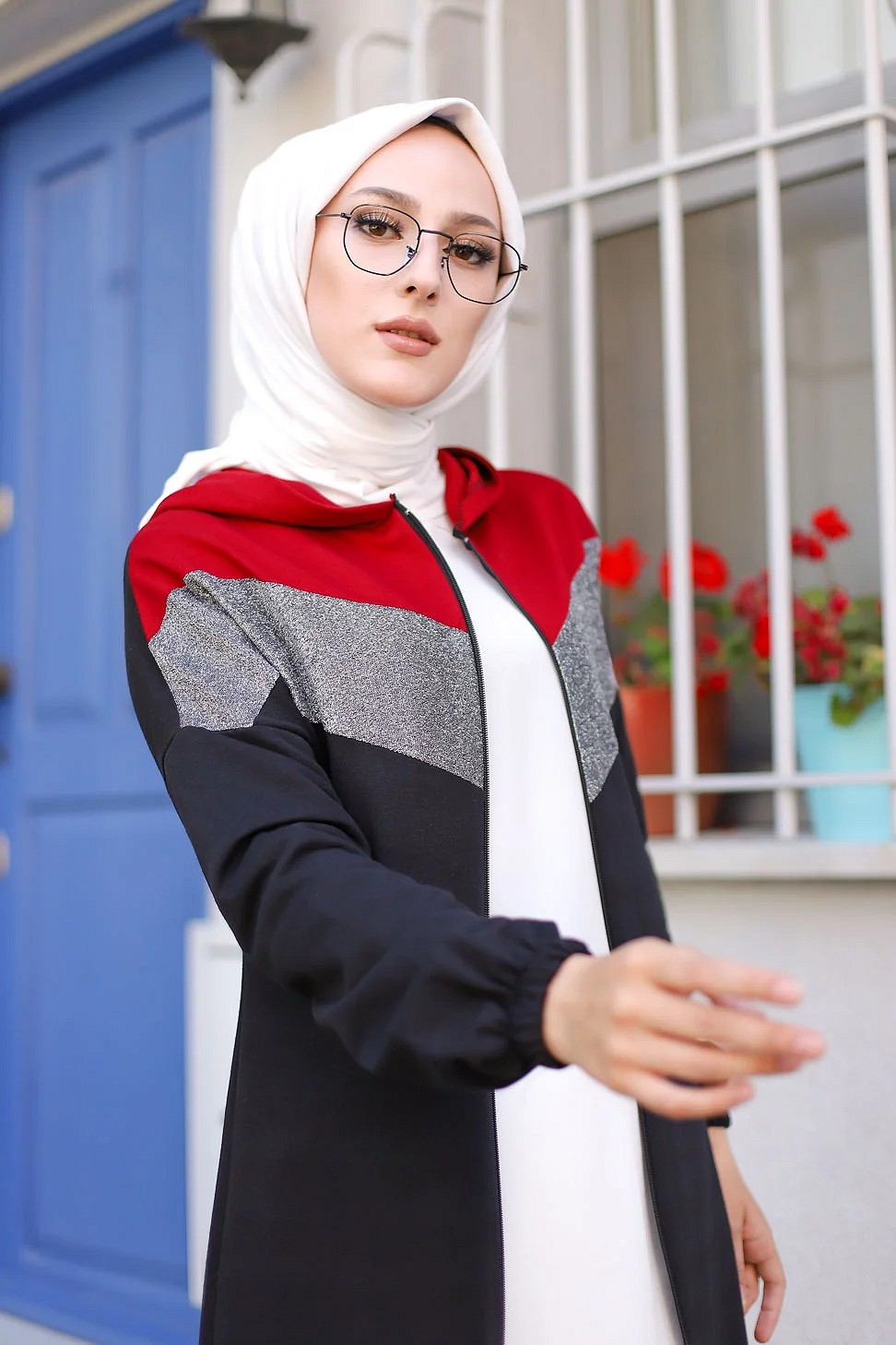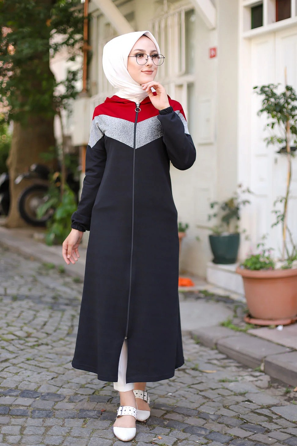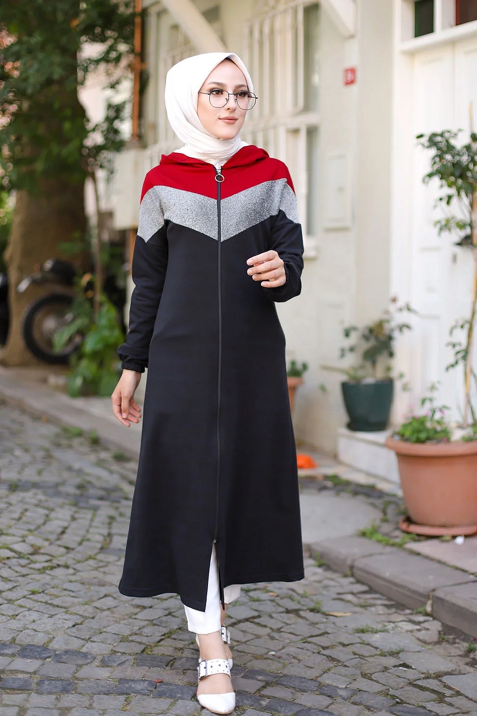 Cardigan long moderne robe zippée style hijab sport avec partie argentée - Couleur noir et bordeaux Vetement & Accessoire