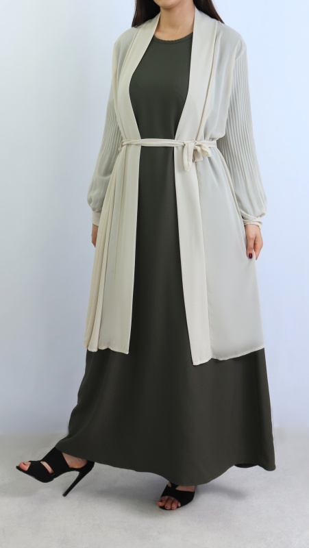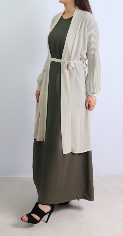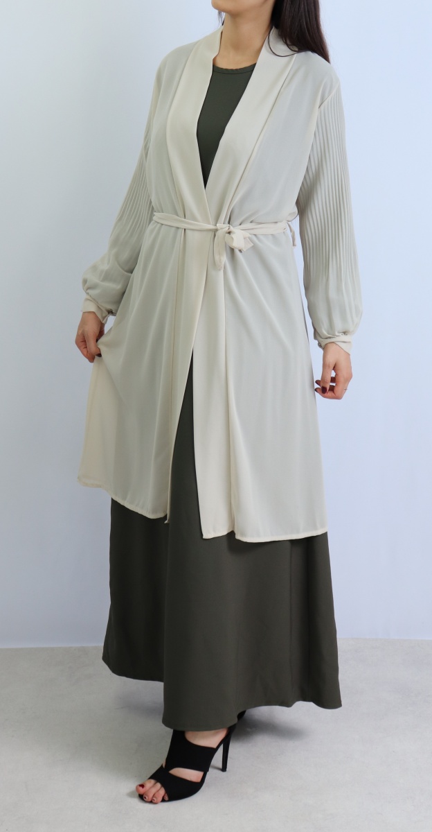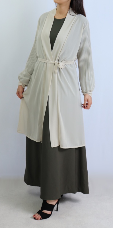 Gilet Veste long col châle manches à froufrou (Modest Fashion France) - Couleur beige - REF. 33936 (25.00 €)