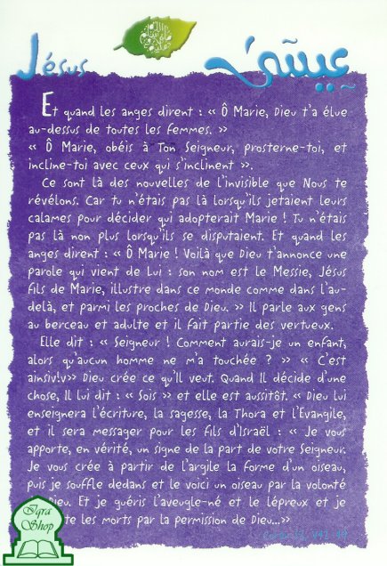 Et quand les Anges dirent : "Ô Marie, Dieu t'a élue au dessus de toutes les femmes". "Ô Marie, obéis à ton Seigneur, prosterne-toi, et incline-toi avec ceux qui s'inclinent". Ce sont là des nouvelles de l'Invisible que Nous te révélons. Car tu n'étais pas là lorsqu'ils jetaient leurs calames pour décider qui adopterait Marie!... (Sourate 3 Al-Imran Versets 42 à 49).