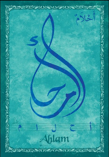 Jolie carte postale représentant le prénom arabe Ahlem calligraphié en arabe ainsi que son épellation lettre par lettre en arabe. Derrière la carte postale se trouve la signification du prénom. Prénom d'origine arabe signifiant rêves.