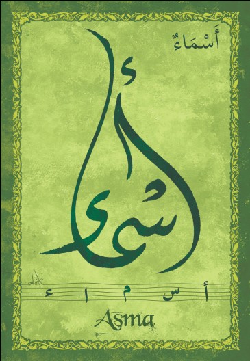 Jolie carte postale représentant le prénom arabe Asma calligraphié en arabe ainsi que son épellation lettre par lettre en arabe. Derrière la carte postale se trouve la signification du prénom. Prénom d'origine arabe signifiant vertueuse.