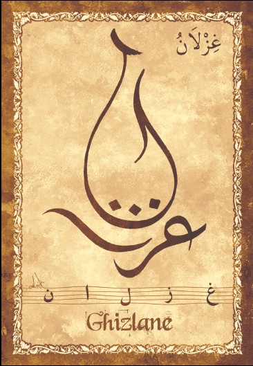 Jolie carte postale représentant le prénom arabe Ghizlane calligraphié en arabe ainsi que son épellation lettre par lettre en arabe. Derrière la carte postale se trouve la signification du prénom. Prénom d'origine arabe signifiant belle, galante,gracieuse.