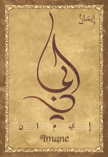 Jolie carte postale représentant le prénom arabe Imane calligraphié en arabe ainsi que son épellation lettre par lettre en arabe. Derrière la carte postale se trouve la signification du prénom. Prénom d'origine arabe signifiant foi.