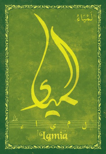 Jolie carte postale représentant le prénom arabe "Lamia" calligraphié en arabe ainsi que son épellation lettre par lettre en arabe. Derrière la carte postale se trouve la signification du prénom.