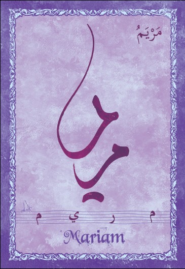Jolie carte postale représentant le prénom arabe Mariam calligraphié en arabe ainsi que son épellation lettre par lettre en arabe. Derrière la carte postale se trouve la signification du prénom.