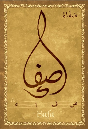 Jolie carte postale représentant le prénom arabe Safa calligraphié en arabe ainsi que son épellation lettre par lettre en arabe. Derrière la carte postale se trouve la signification du prénom. Prénom d'origine arabe signifiant pureté, clarté, transparence.