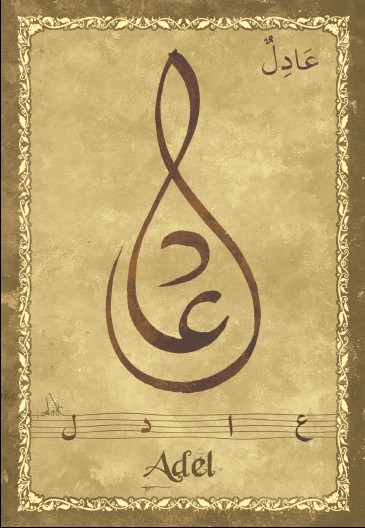 Jolie carte postale représentant le prénom arabe Adel calligraphié en arabe ainsi que son épellation lettre par lettre en arabe. Derrière la carte postale se trouve la signification du prénom.