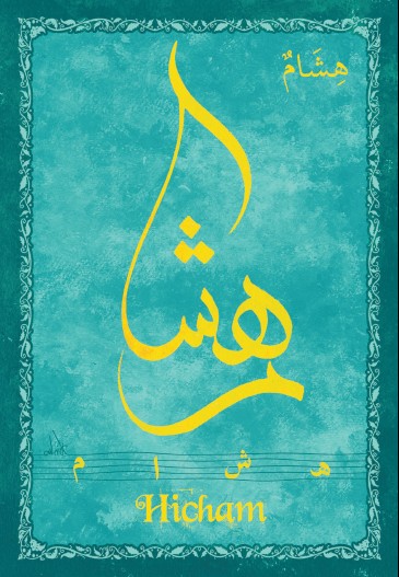 Jolie carte postale représentant le prénom arabe Hicham calligraphié en arabe ainsi que son épellation lettre par lettre en arabe. Derrière la carte postale se trouve la signification du prénom.