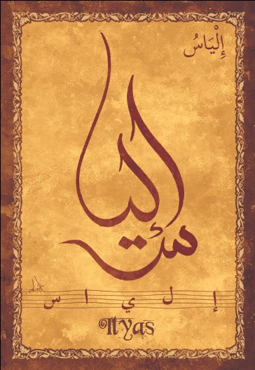 Jolie carte postale représentant le prénom arabe Ilyas calligraphié en arabe ainsi que son épellation lettre par lettre en arabe. Derrière la carte postale se trouve la signification du prénom.