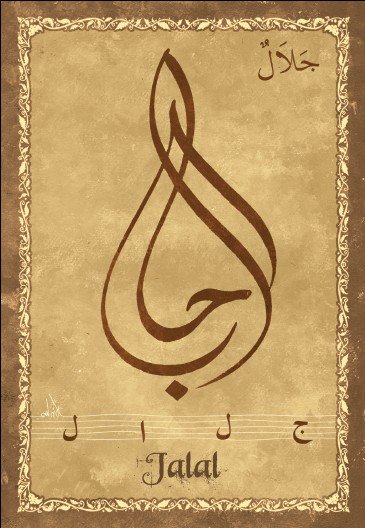 Jolie carte postale représentant le prénom arabe Jalal calligraphié en arabe ainsi que son épellation lettre par lettre en arabe. Derrière la carte postale se trouve la signification du prénom.