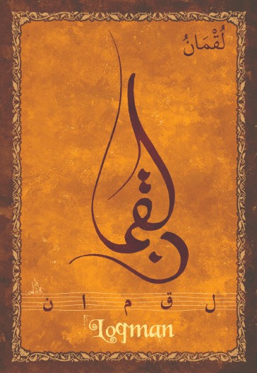 Jolie carte postale représentant le prénom arabe Loqman calligraphié en arabe ainsi que son épellation lettre par lettre en arabe. Derrière la carte postale se trouve la signification du prénom. Prénom d'origine arabe signifiant la voie clair.