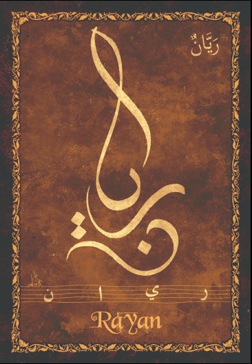 Jolie carte postale représentant le prénom arabe Rayan calligraphié en arabe ainsi que son épellation lettre par lettre en arabe. Derrière la carte postale se trouve la signification du prénom.