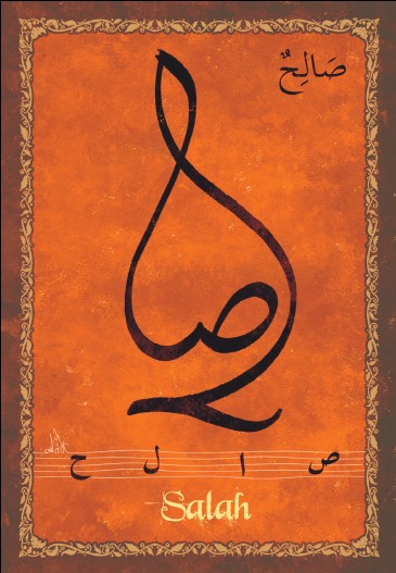 Jolie carte postale représentant le prénom arabe Salah calligraphié en arabe ainsi que son épellation lettre par lettre en arabe. Derrière la carte postale se trouve la signification du prénom.
