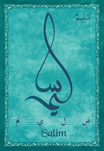 Jolie carte postale représentant le prénom arabe Salim calligraphié en arabe ainsi que son épellation lettre par lettre en arabe. Derrière la carte postale se trouve la signification du prénom.