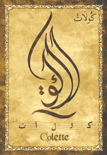 Jolie carte postale représentant le prénom français Colette calligraphié en arabe ainsi que son épellation lettre par lettre en arabe. Derrière la carte postale se trouve la signification du prénom. Prénom d'origine grec signifiant victoire du peuple.