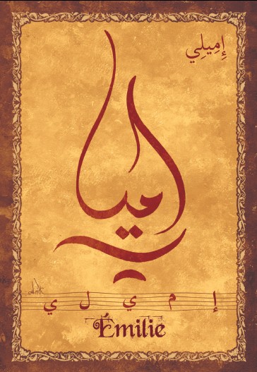 Jolie carte postale représentant le prénom français Emilie calligraphié en arabe ainsi que son épellation lettre par lettre en arabe. Derrière la carte postale se trouve la signification du prénom. Prénom d'origine latine signifiant celle qui rivalise.