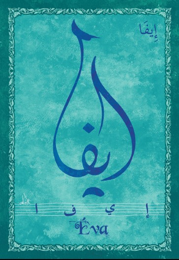 Jolie carte postale représentant le prénom français Eva calligraphié en arabe ainsi que son épellation lettre par lettre en arabe. Derrière la carte postale se trouve la signification du prénom. Prénom d'origine hébreu signifiant source de vie vivante.