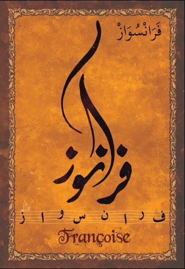 Jolie carte postale représentant le prénom français Françoise calligraphié en arabe ainsi que son épellation lettre par lettre en arabe. Derrière la carte postale se trouve la signification du prénom. Prénom d'origine latine signifiant franche, libre.