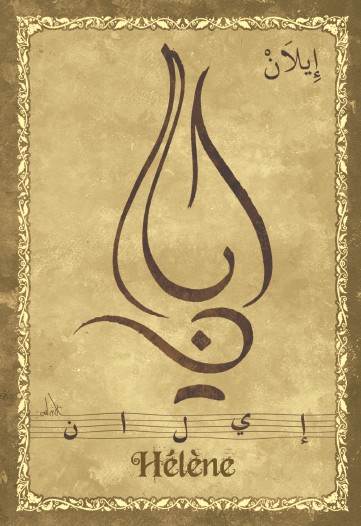 Jolie carte postale représentant le prénom français Hélène calligraphié en arabe ainsi que son épellation lettre par lettre en arabe. Derrière la carte postale se trouve la signification du prénom. Prénom d'origine grec signifiant éclat du soleil.