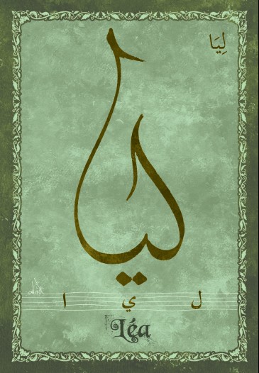 Jolie carte postale représentant le prénom français Léa calligraphié en arabe ainsi que son épellation lettre par lettre en arabe. Derrière la carte postale se trouve la signification du prénom. Prénom d'origine latine signifiant lionne.