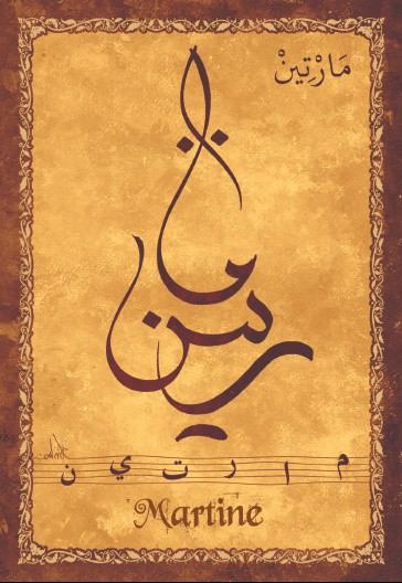 Jolie carte postale représentant le prénom français Martine calligraphié en arabe ainsi que son épellation lettre par lettre en arabe. Derrière la carte postale se trouve la signification du prénom. Prénom d'origine latin signifiant guerrière.