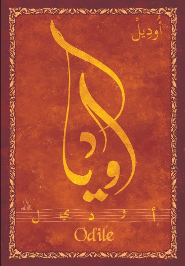 Jolie carte postale représentant le prénom français Odile calligraphié en arabe ainsi que son épellation lettre par lettre en arabe. Derrière la carte postale se trouve la signification du prénom. Prénom d'origine germanique signifiant richesse.