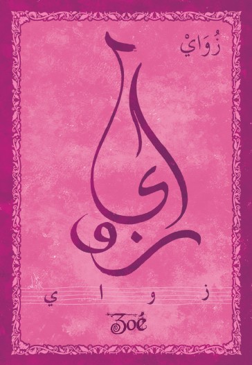 Jolie carte postale représentant le prénom français Zoé calligraphié en arabe ainsi que son épellation lettre par lettre en arabe. Derrière la carte postale se trouve la signification du prénom. Prénom d'origine grec signifiant vie.
