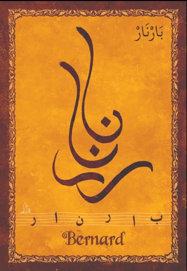Jolie carte postale représentant le prénom français Bernard calligraphié en arabe ainsi que son épellation lettre par lettre en arabe. Derrière la carte postale se trouve la signification du prénom.