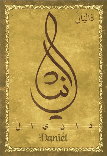 Jolie carte postale représentant le prénom français Daniel calligraphié en arabe ainsi que son épellation lettre par lettre en arabe. Derrière la carte postale se trouve la signification du prénom. Prénom d'origine hébreu signifiant Dieu est Juge.