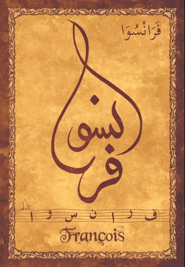 Jolie carte postale représentant le prénom français François calligraphié en arabe ainsi que son épellation lettre par lettre en arabe. Derrière la carte postale se trouve la signification du prénom. Prénom d'origine latine signifiant franc, libre.