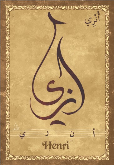 Jolie carte postale représentant le prénom français Henri calligraphié en arabe ainsi que son épellation lettre par lettre en arabe. Derrière la carte postale se trouve la signification du prénom. Prénom d'origine germanique signifiant maison du roi.