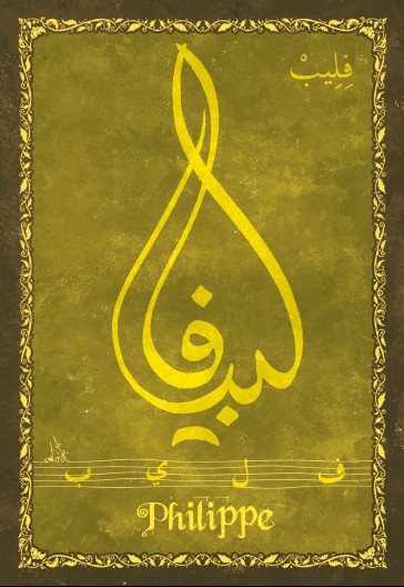 Jolie carte postale représentant le prénom français Philippe calligraphié en arabe ainsi que son épellation lettre par lettre en arabe. Derrière la carte postale se trouve la signification du prénom.