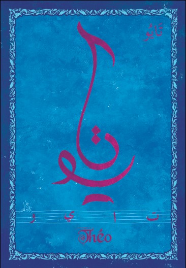 Jolie carte postale représentant le prénom français Théo calligraphié en arabe ainsi que son épellation lettre par lettre en arabe. Derrière la carte postale se trouve la signification du prénom. Prénom d'origine grec qui est un diminutif des prénoms commençant par Théo.
