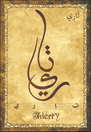 Jolie carte postale représentant le prénom français Thierry calligraphié en arabe ainsi que son épellation lettre par lettre en arabe. Derrière la carte postale se trouve la signification du prénom. Prénom d'origine germanique signifiant puissant dans le peuple.