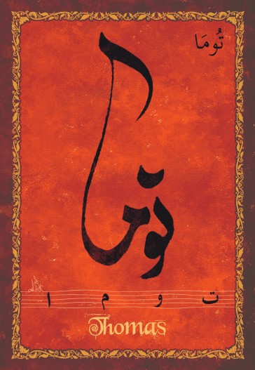 Jolie carte postale représentant le prénom français Thomas calligraphié en arabe ainsi que son épellation lettre par lettre en arabe. Derrière la carte postale se trouve la signification du prénom. Prénom d'origine araméen signifiant jumeau