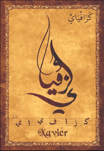 Jolie carte postale représentant le prénom français Xavier calligraphié en arabe ainsi que son épellation lettre par lettre en arabe. Derrière la carte postale se trouve la signification du prénom. Prénom d'origine basque signifiant maison neuve.