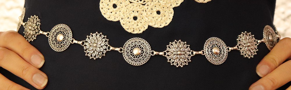 Ceinture argentée ornée de pièces à motifs, fermeture mousqueton, chaine ajustable finition petite fleur.