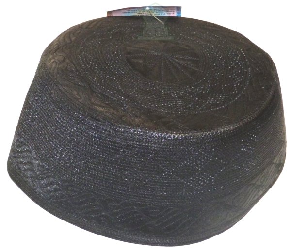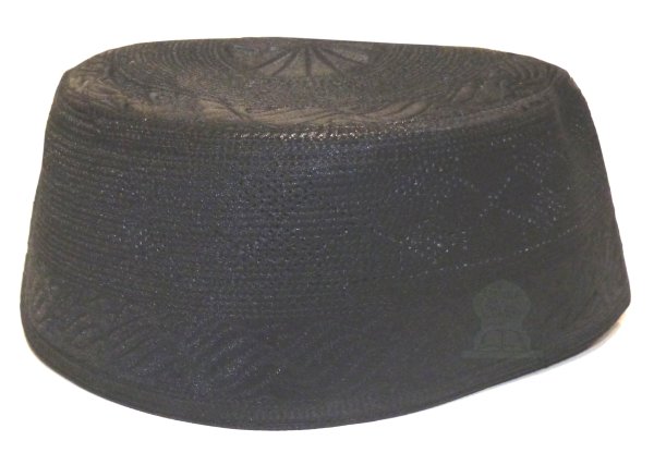 Chachia rigide de couleur noire, avec de discrets motifs brodés, fabriquée au Bangladesh.