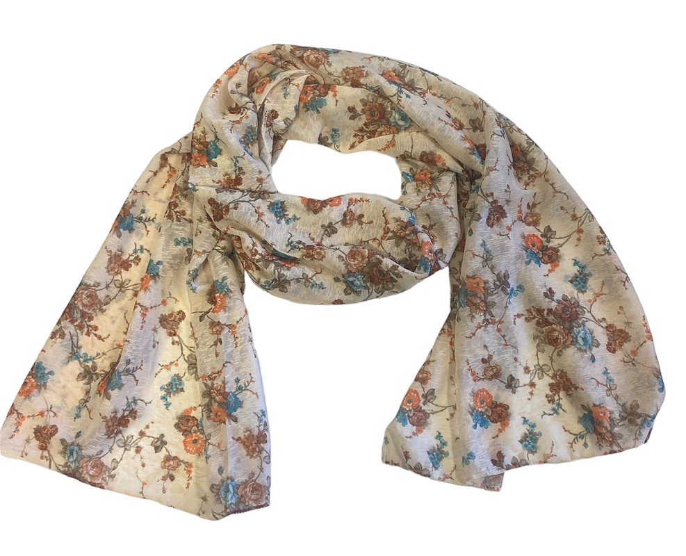 Châle Hijab à fleurs pour femme - Fleur marron, orange et bleu sur un fond beige Vetement & Accessoire