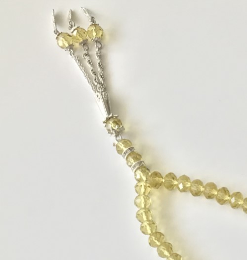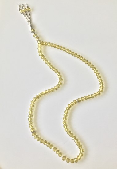 Chapelet (Tasbîh) de luxe à 33 perles en cristal de couleur jaune or avec petites perles argentées - REF. 32731 (7.50 €)