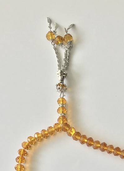 Chapelet (Tasbîh) de luxe à 33 perles en cristal de couleur jaune or avec petites perles argentées - REF. 32731 (7.50 €)
