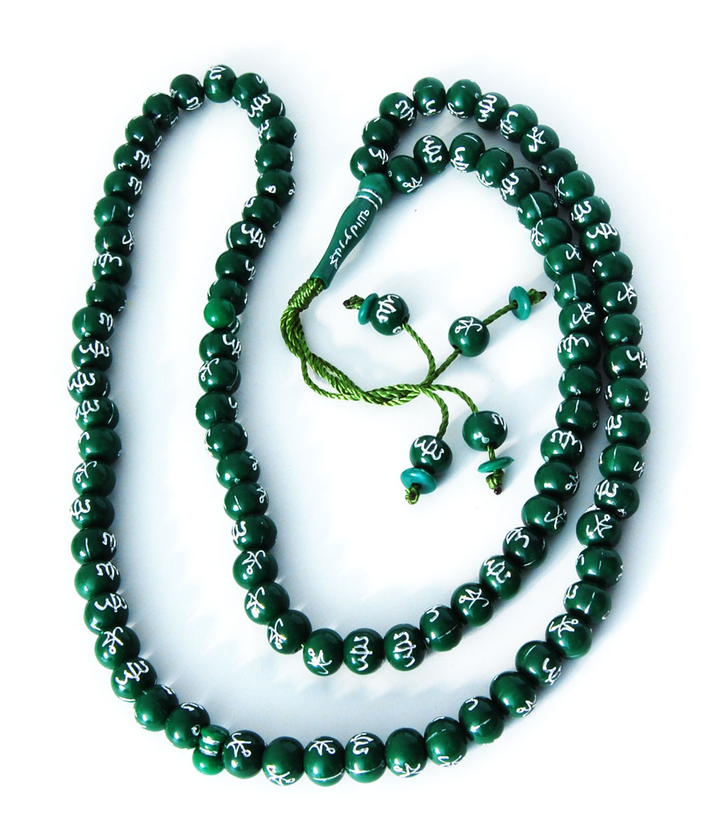 Chapelet "Sebha" 99 grains couleur Vert Foncé avec les noms d'Allah et du Prophète Muhammad (SAW) sur chaque grain. Un séparateur est placé tous les 33 grains.