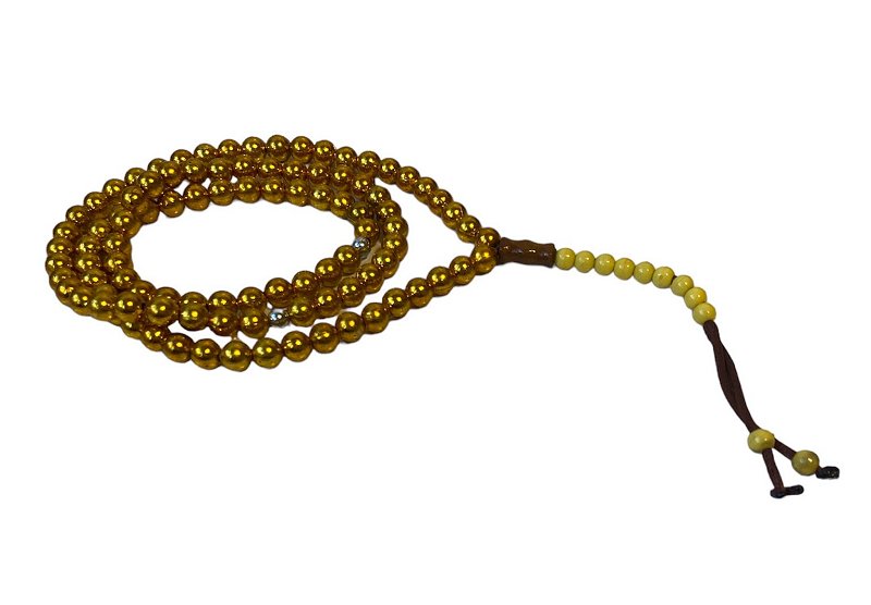 Chapelet (Sebha) à 99 perles dorées avec 2 séparateurs ronds argentés et ponpon à billes jaunes.