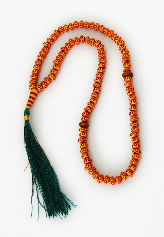 Chapelet "Sebha" à 99 grains de couleur marron clair, avec motifs circulaire (o) ou rectiligne (I) sur chaque grain.