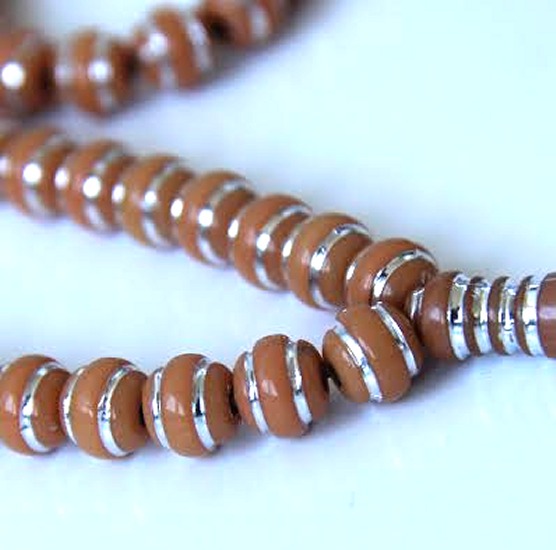 Chapelet (Sabha) de couleur camel à 99 grains ronds avec décorations argentées et séparations tous les 33 grains.