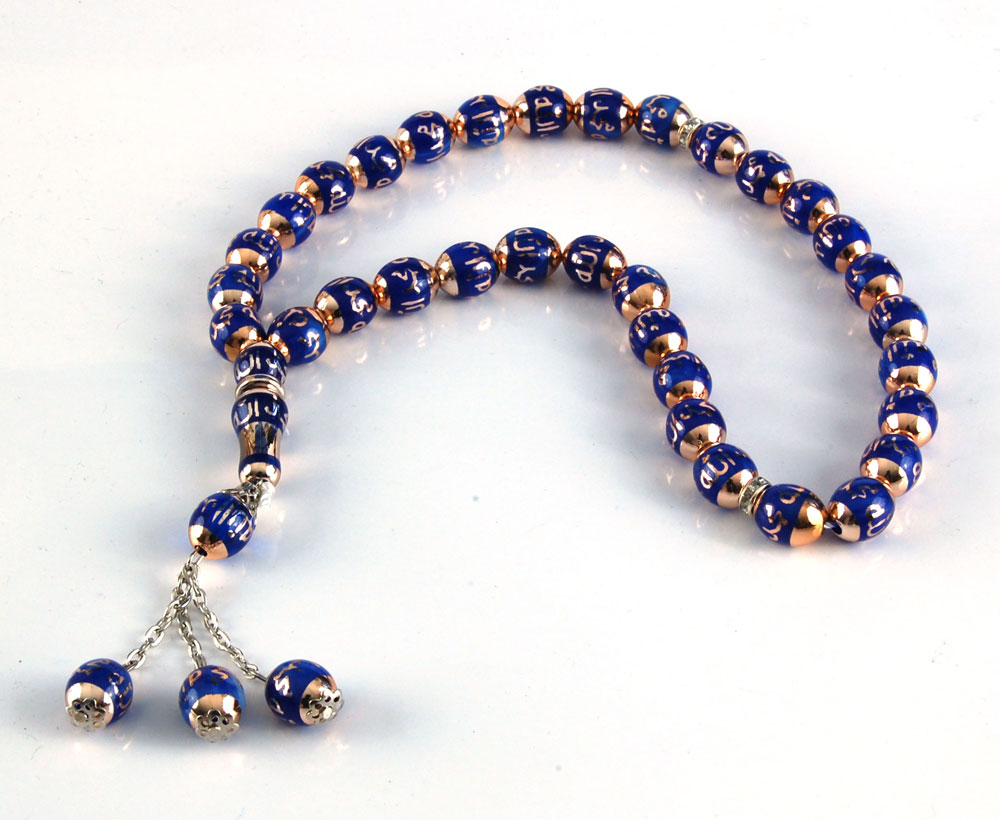 Chapelet (sebha) à 33 perles bleues dorées Avec inscription Allah-Mohammed. Avec séparateur toutes les 11 perles.