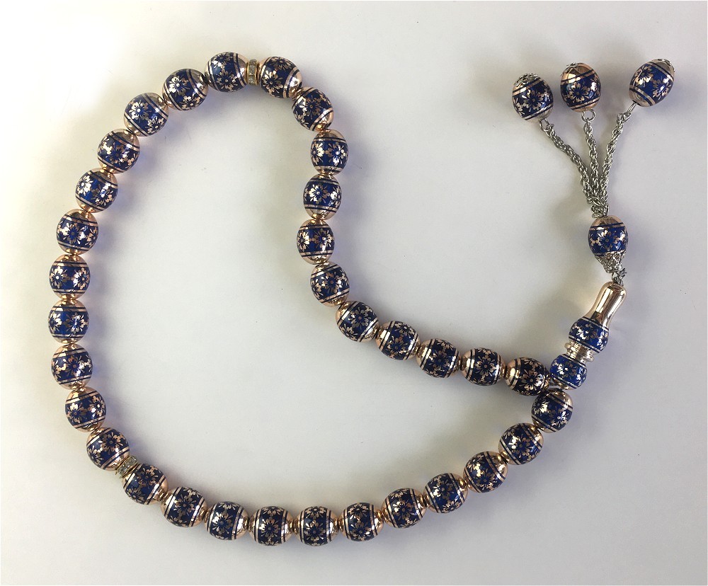 Chapelet (Sebha) à 33 perles de couleur bleues dorées. Avec séparateur toutes les 11 perles.