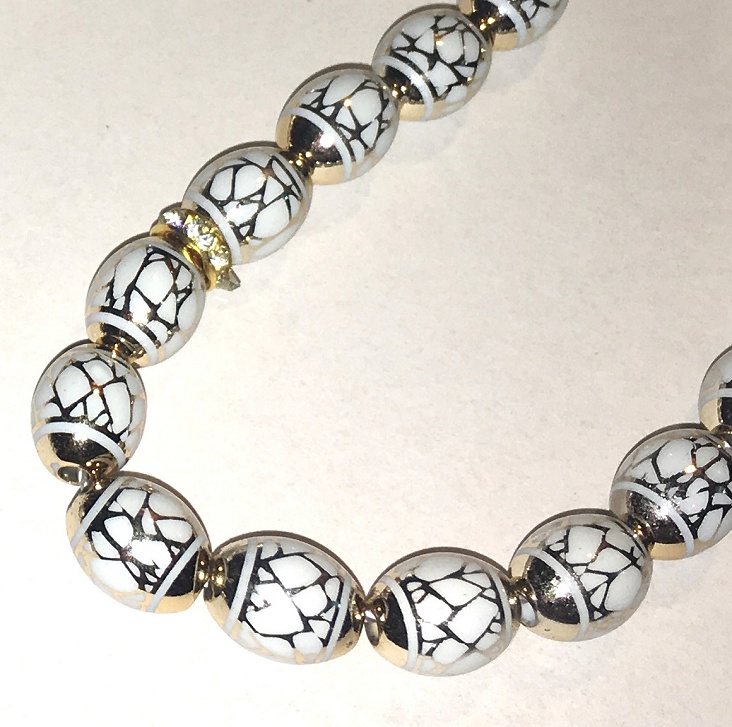 Beau chapelet blanc avec des motifs en treillis dorés. Il contient 33 grains plus quelques-uns qui servent de décoration.