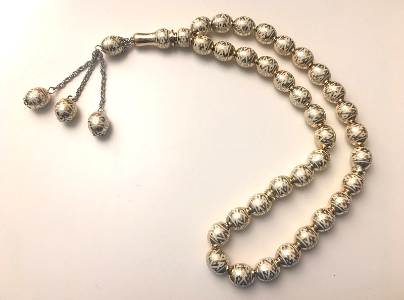 Le chapelet est fait de grosses perles dorées avec jolies décorations, on peut par exemple utiliser ce chapelet pour la formule classique où il faut dire : 33 fois "SoubhanAllah" puis 33 fois "AlHamdoulillah" puis 33 fois "Allahou Akbar".
