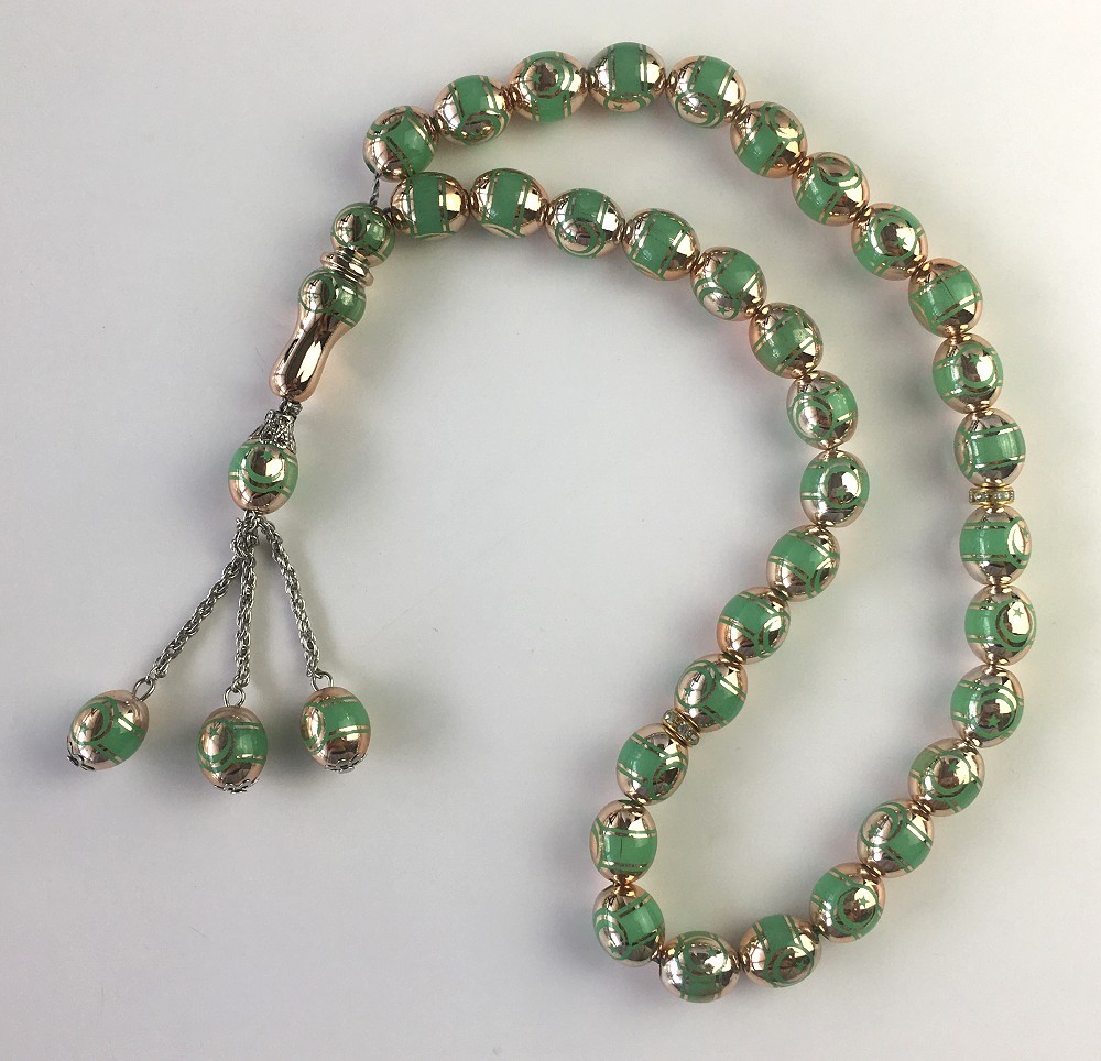Chapelet (Sebha) à 33 perles de couleur vertes avec croissant et étoile sur chaque perle. Séparateur toutes les 11 perles.